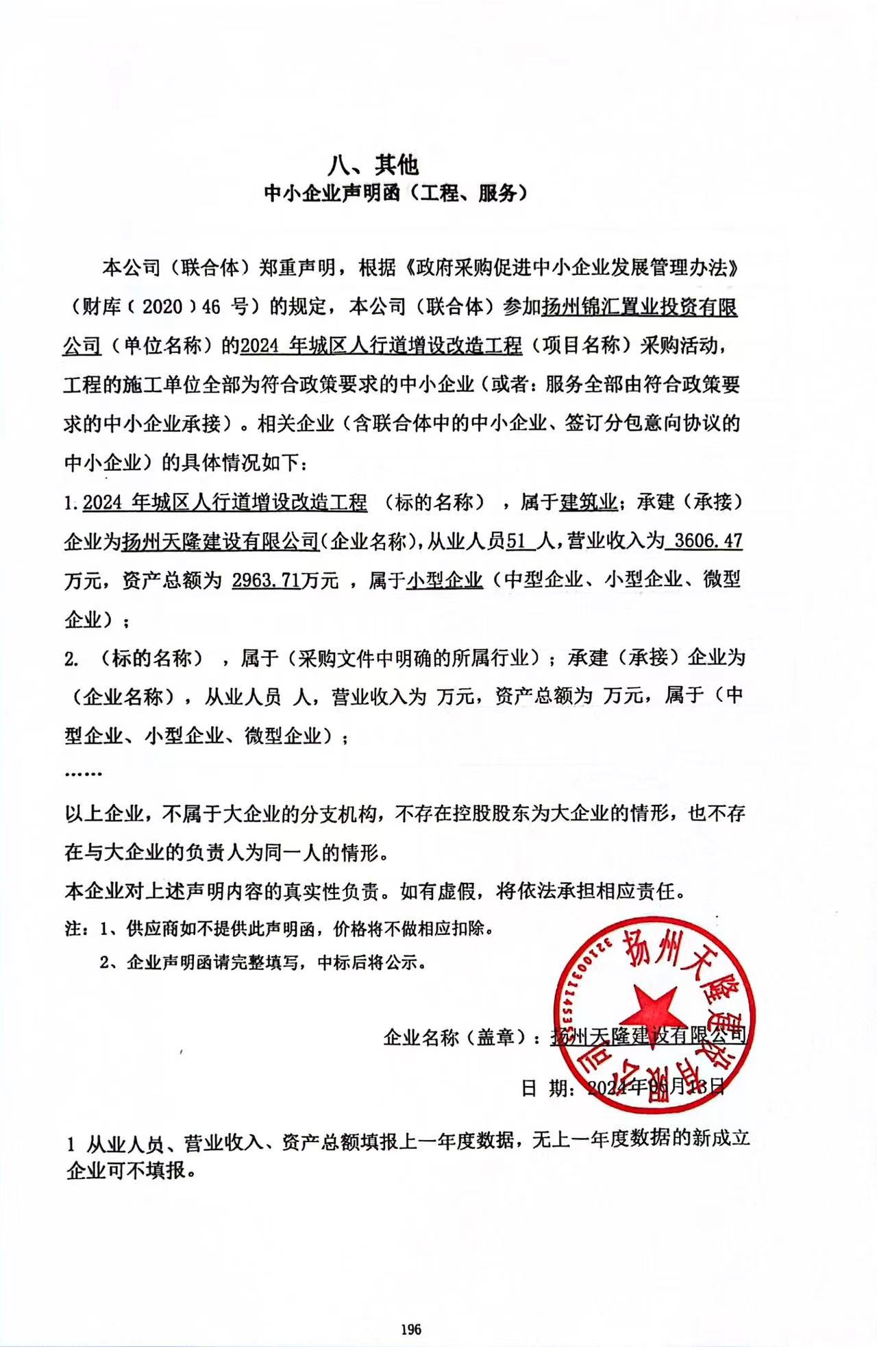 五、評審專家名單:楊坤、沈樹超、徐敬雯 六、公告期限 自本公告發(fā)布之日起1個工作日。 七、其他補(bǔ)充事宜 無 八、凡對本次公告內(nèi)容提出詢問,請按以下方式聯(lián)系。 1.采購人信息 名 稱:揚(yáng)州錦匯置業(yè)投資有限公司 2.采購代理機(jī)構(gòu)信息 名 稱:揚(yáng)州筑苑工程招標(biāo)咨詢有限公司 地 址:揚(yáng)州潤揚(yáng)北路19號 聯(lián) 系 人:李斌 聯(lián)系電話:0514-87116778 3.項目聯(lián)系方式 項目聯(lián)系人:李斌 電 話:0514-87116778 揚(yáng)州筑苑工程招標(biāo)咨詢有限公司 2024年6月13日 中小企業(yè)聲明函.jpg